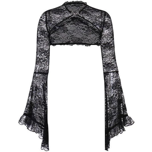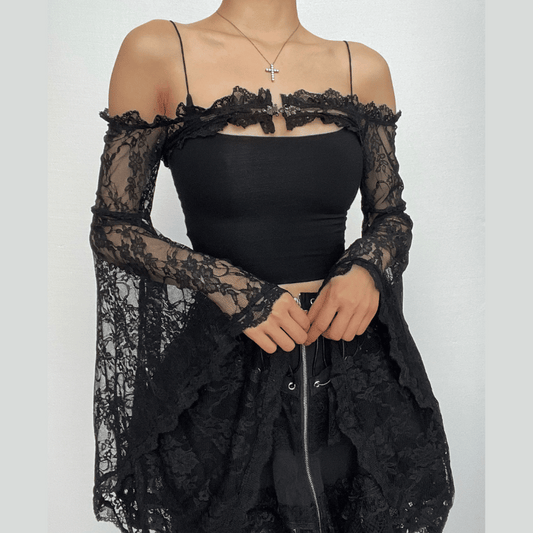 Lace off shoulder flared sleeve solid button shrug top