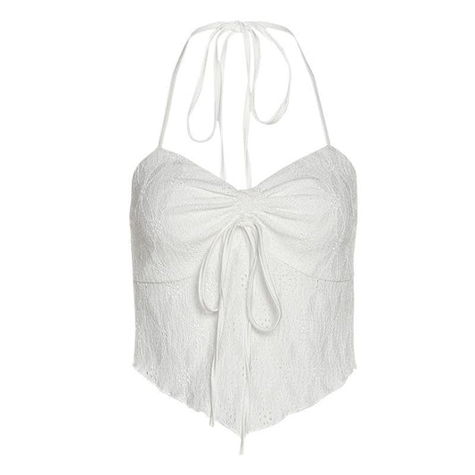 Backless self tie textured halter sleeveless ruffle crop top