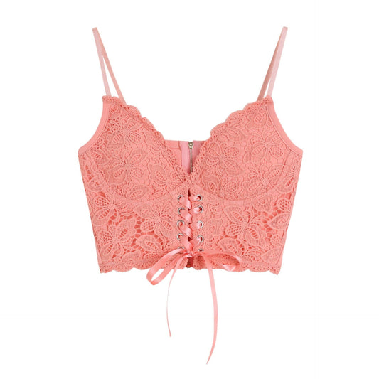 V neck heart neck solid lace up zip-up lace hem cami top