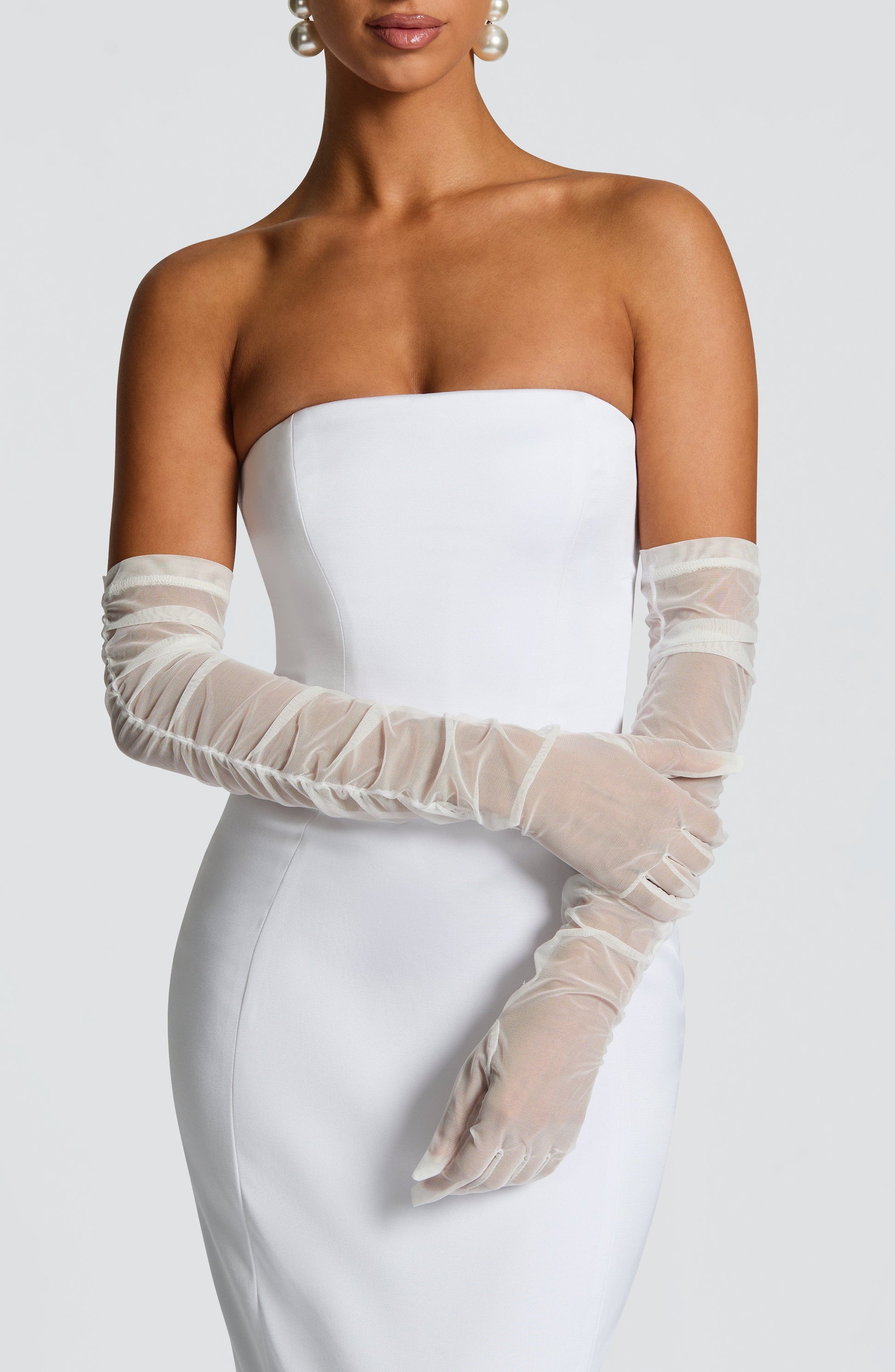 Elevate your ensemble with our Ada Gloves in elegant ivory. Crafted from luxuriously soft stretch mesh, these sophisticated above-elbow length gloves offer timeless refinement. The delicate fabric ensures a perfect fit while providing graceful movement for special occasions or evening attire.