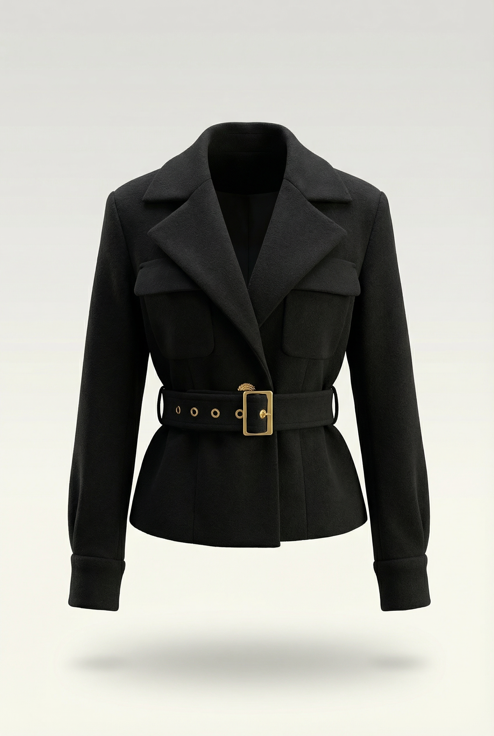 A short jacket designed to structure the upper body and refine the silhouette. The fitted cut follows your lines, while the adjustable belt highlights the waist as desired. The tailored collar and single-button closure maintain a clean, sharp tailored look, and the patch pockets balance the design with a chic utilitarian touch. The result: a piece that instantly elevates any outfit, effortlessly.