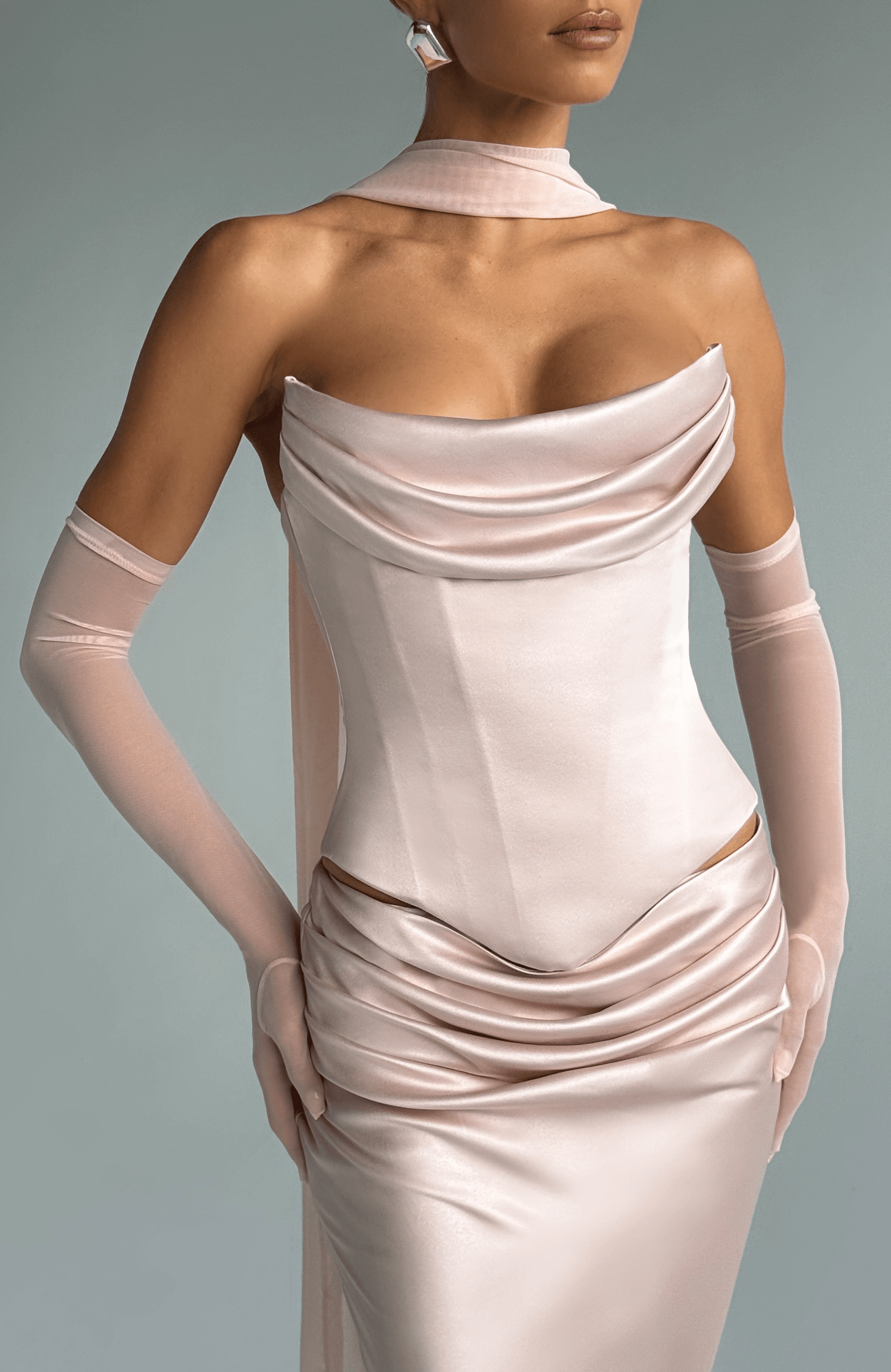 The Eli Gloves in Soft Peach are the epitome of elegance. Made from delicate stretch mesh, these elbow-length gloves offer a lightweight, sheer finish that beautifully contours to the arms. Colour: Soft Peach.
