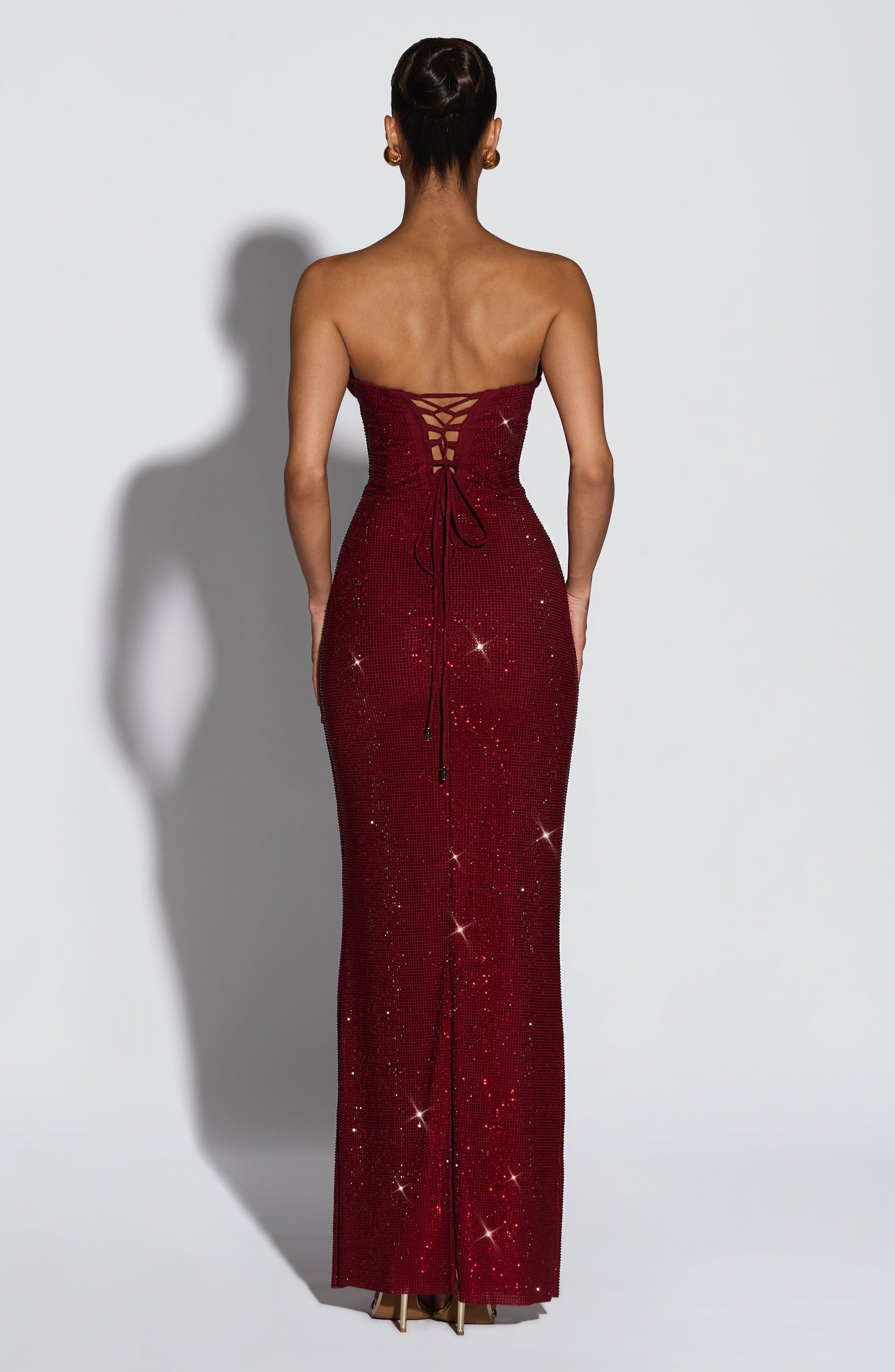 Indulge in the Mirabella Maxi Dress. The stretch mesh fabric provides comfort while the hotfix rhinestones add a touch of opulence. The strapless neckline is beautifully adorned with a pleated cowl, and the column shape skirt creates a flattering silhouette. Structural details, including an internal corset and open lace up back, provide an impeccable fit.