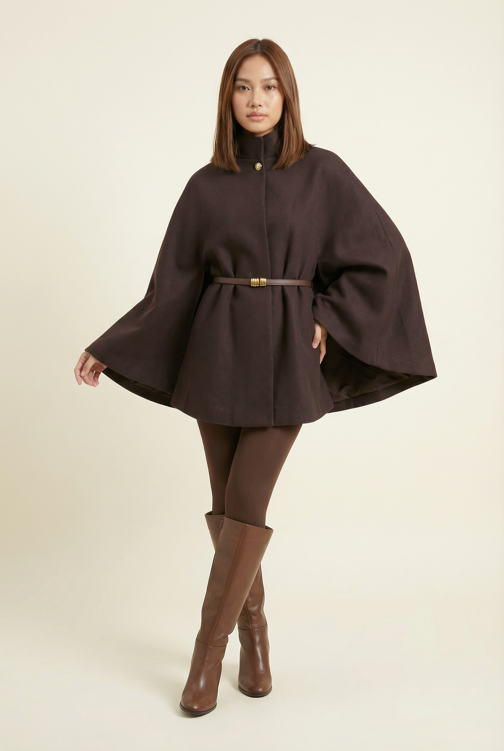Designed for those who want a piece that “dresses” effortlessly. The cape shape wraps the silhouette, creates movement, and allows true ease at the arms thanks to the batwing sleeves. The stand-up collar keeps the line clean, and the addition of a belt cinches the waist, transforming the look in an instant.